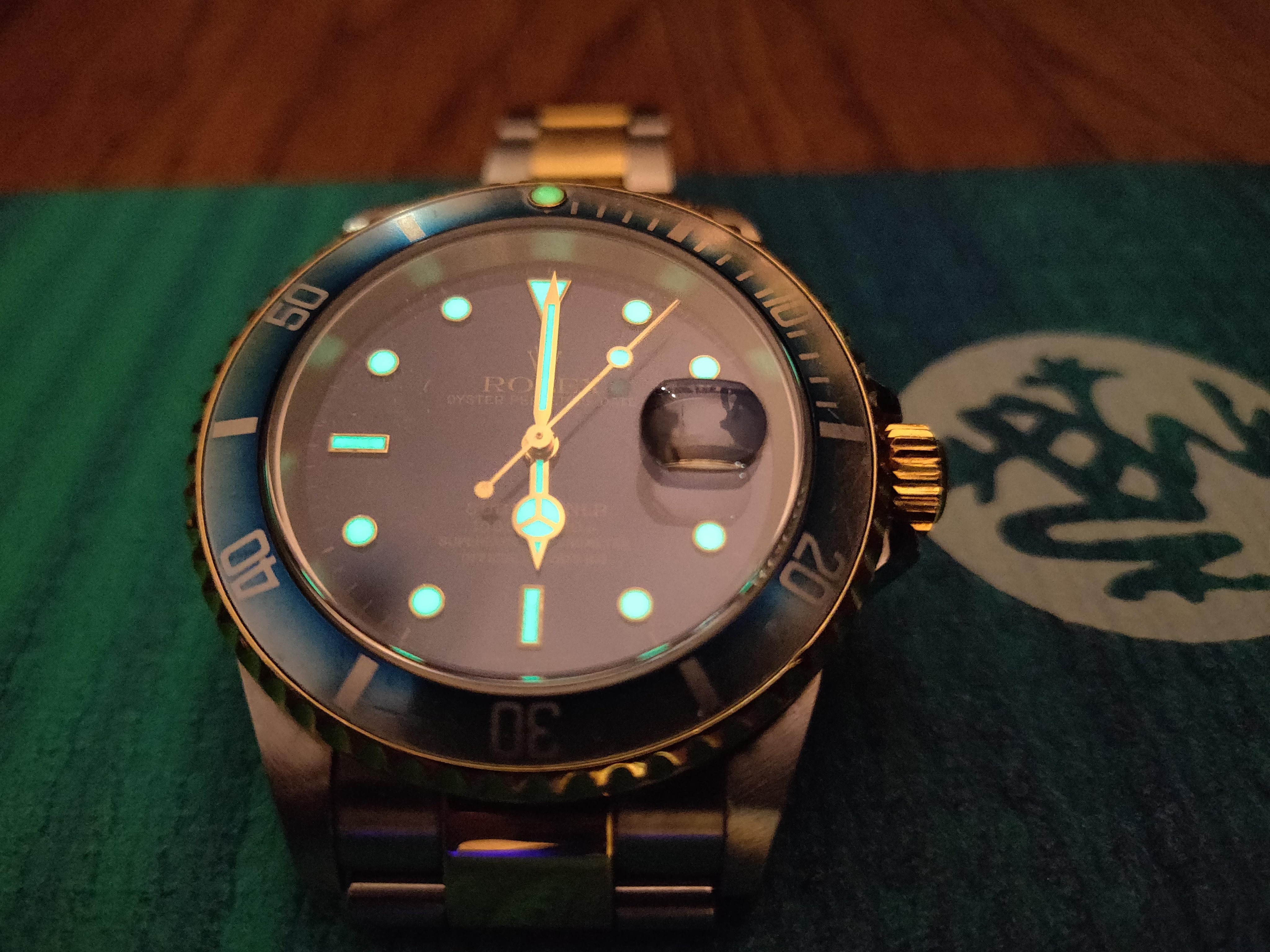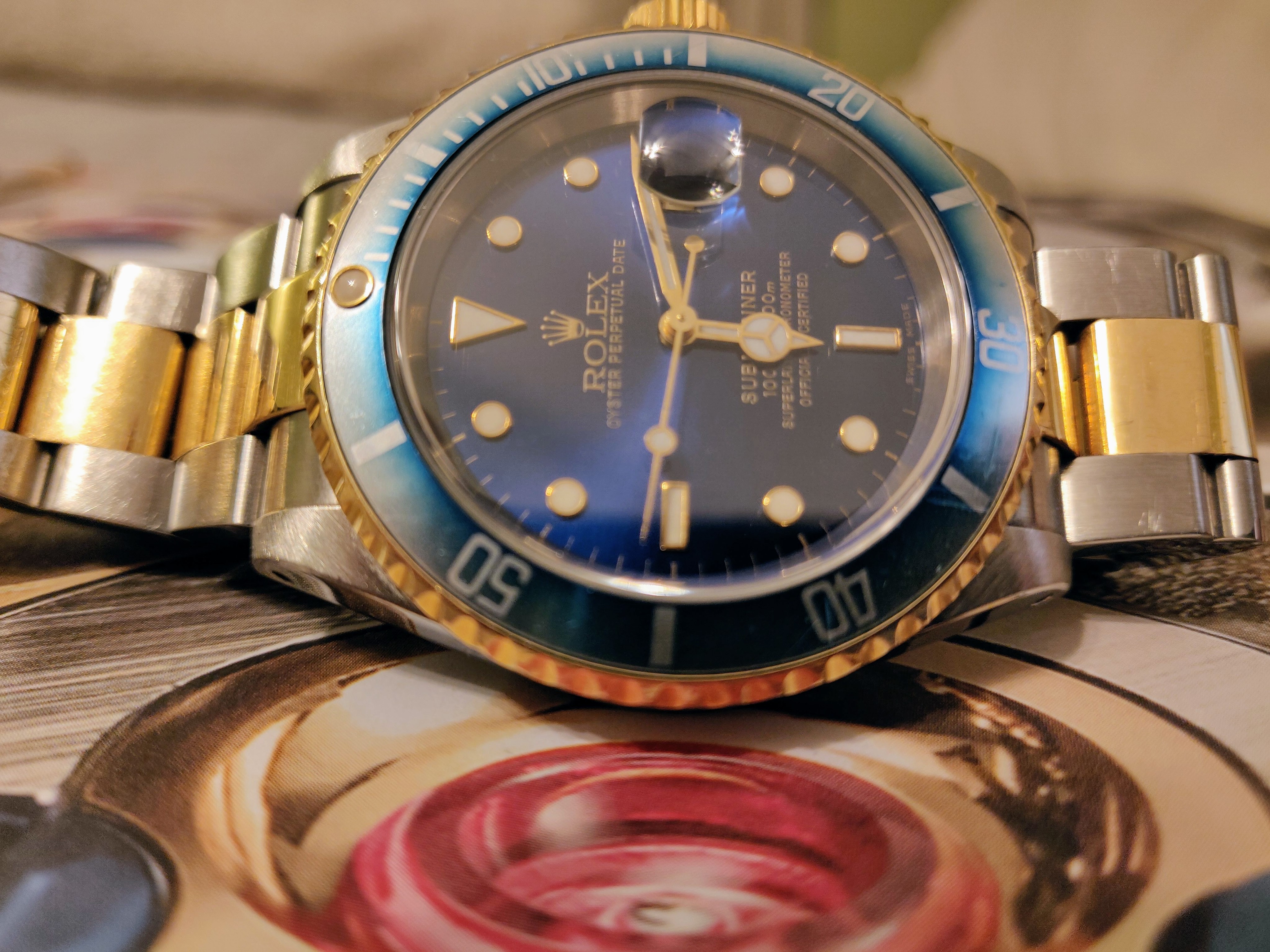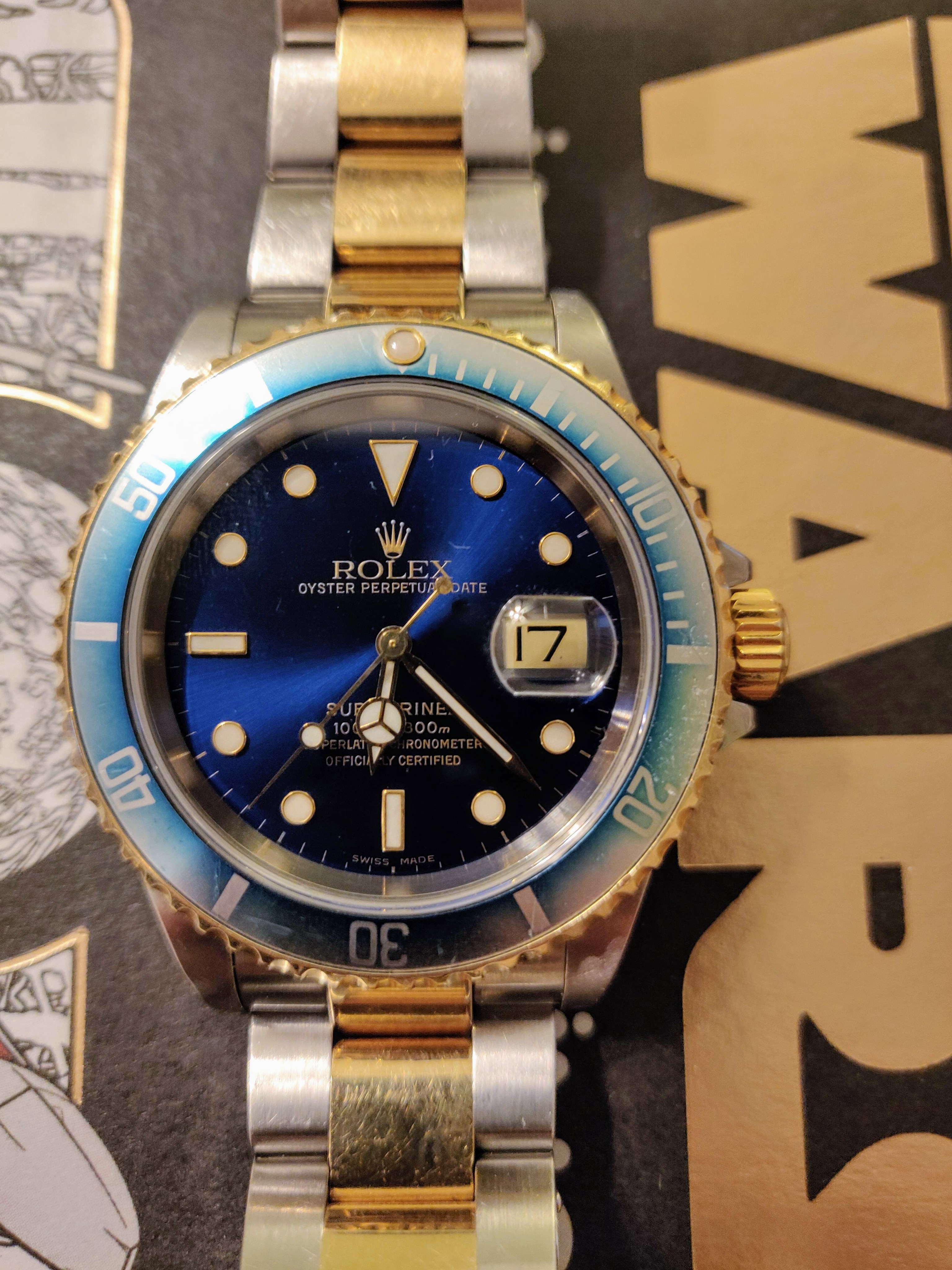 The 16610 is what most people think of when they hear Rolex. There is also a solid gold version, the 16618. My 16613 turns the dial blue and mixes in some yellow gold with the stainless steel for a two-tone look.