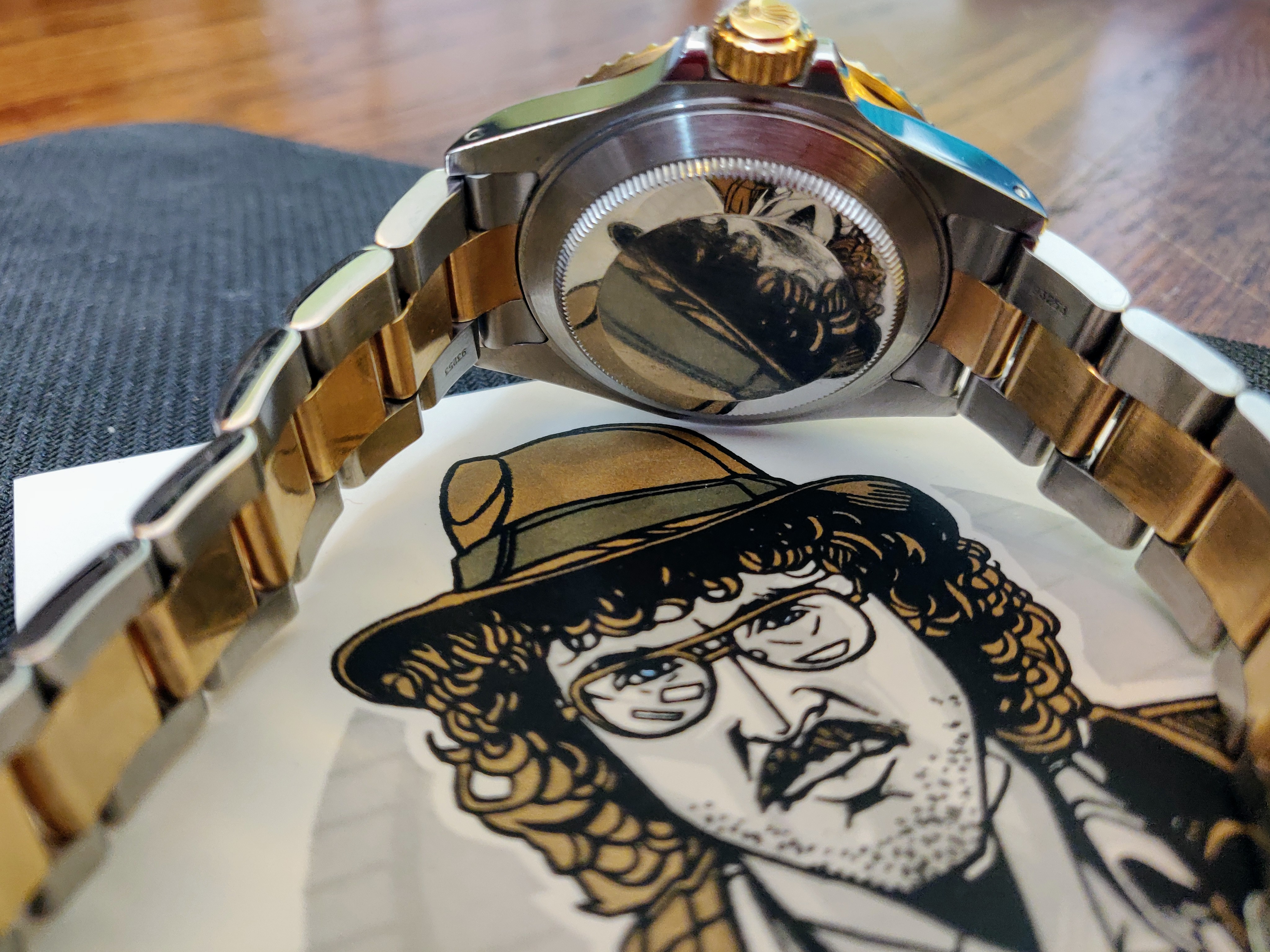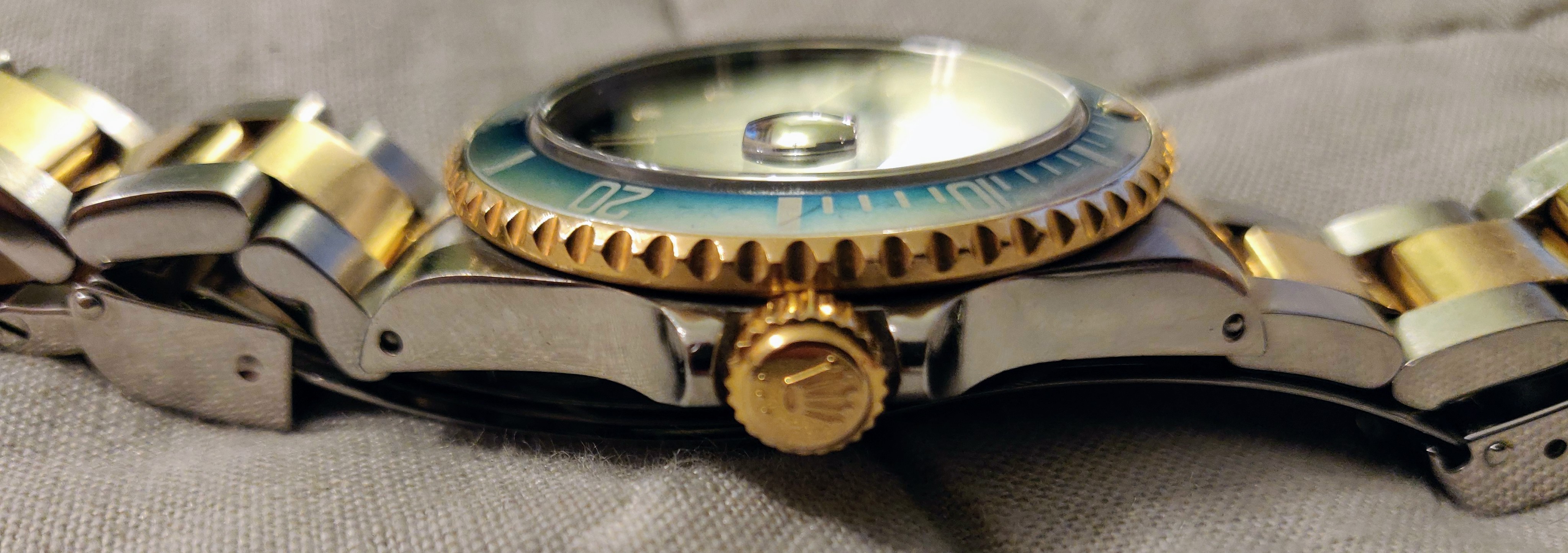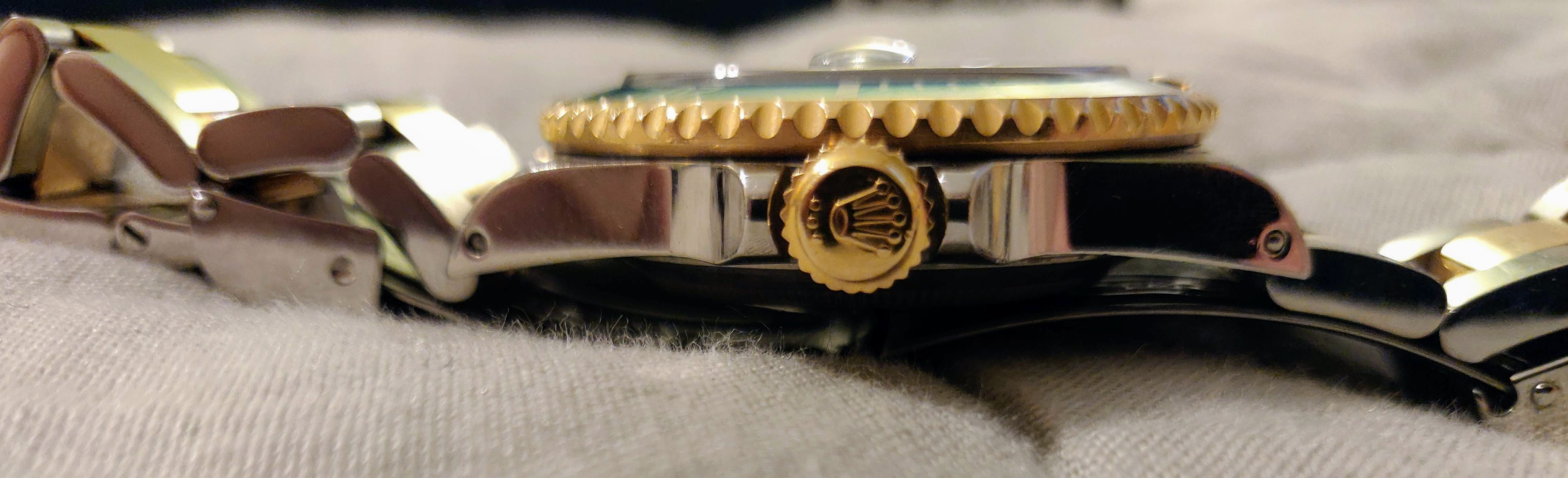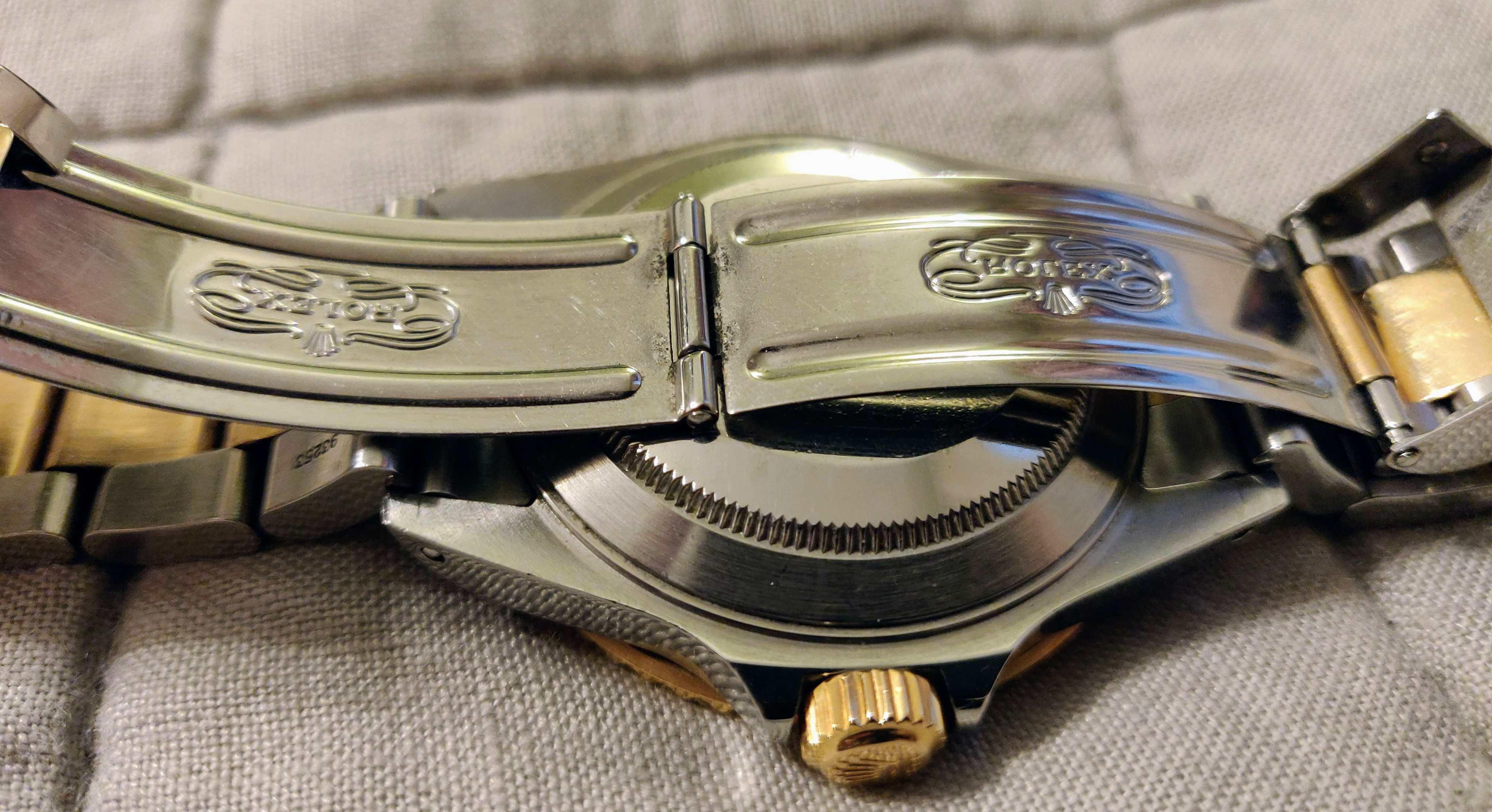 The two-tone nature of the watch extends to the bracelet, and it’s apparent that this watch has lived a good life (along with its owner – Hi, Dad!). Both sides have scratches of experience, with the outer side reasonably bearing the brunt. The clasp is a simple butterfly deployant clasp, with the Rolex logo stamped on the fold-over piece. This predates Rolex Glidelock, but it wouldn’t be a proper dive watch without a dive extension. Pushing down on an inside link unhooks a section of the bracelet from a crossbar inside the clasp, allowing you to add approximately 1.5″ to the length. This is intended to allow the watch to fit over a wet suit, but it also serves to give your wrist a little extra breathing space on a hot summer day.